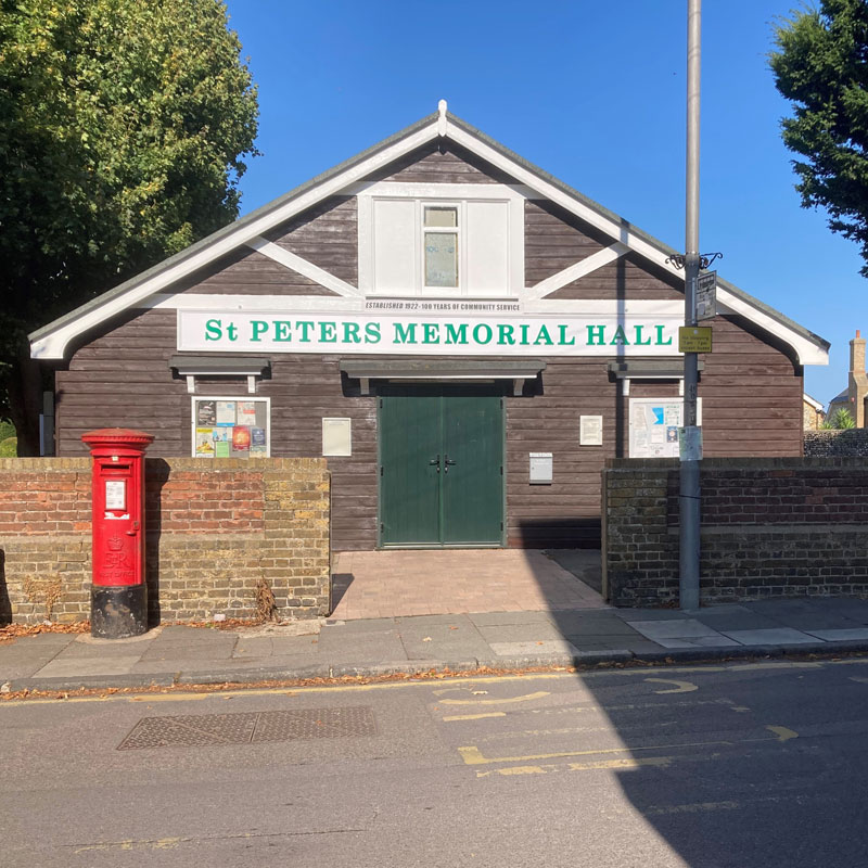 Originally bought in 1924 as a War Surplus item, having been used as an army hut at Richborough , the Old Parish Hut has been on its current site ever since. In 1977 a new charity was formed, the hall was modernised and renamed St Peters Memorial Hall. In 2017, the charity was changed to a Charitable Incorporated Organisation, number 1175949, and further modernisation is ongoing.